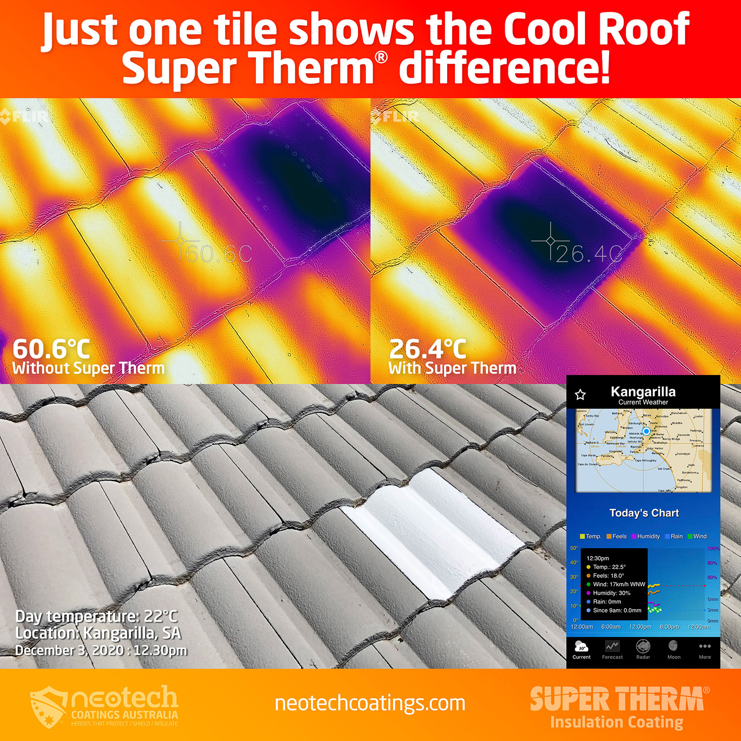 A single tile painted with Super Therm dropped the temperature from 60°C to 26°C on a 24°C day