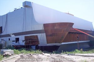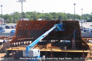Up the sides of the hull below water line, MOIST METAL GRIP is applied up to the water line mark. Then, 5 feet below the water line and over the existing MOIST METAL GRIP, ENAMO GRIP is applied to prevent UV rays from penetrating through the water and chalking MOIST METAL GRIP.