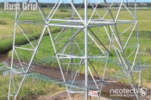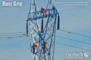At Tomago on the Hunter River near Newcastle, TEMCO was engaged by AusGrid to refurbish a power transmission tower operating in a C4 marine environment with moderate salt exposure. Instead of a traditional three-coat zinc-rich primer system requiring sandblasting, TEMCO selected Rust Grip® – a single-component aluminium moisture-cured urethane rated ISO 12944 C5-H for very high-corrosive environments.