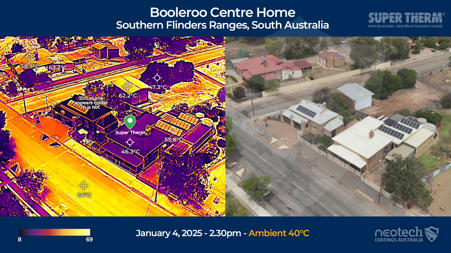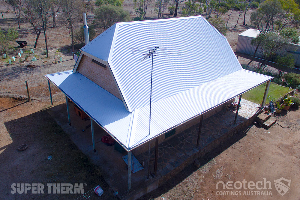 Historic house was painted in Booleroo Centre, Flinders Ranges with Super Therm tinted to yellow. The client went from 9 hours air conditioner to 1 hour per day in summer. Roof is cooler than the surrounding envrionent.
